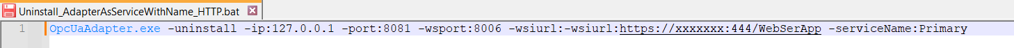 1. In C:\Program Files (x86)\Siemens\OPC UA Adapter, open the file Uninstall_AdapterAsServiceWithName_HTTP.bat with a text editor.